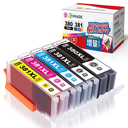 GPCのBCI-381XL/BCI-380XL互換インクカートリッジ5色セット。大容量タイプで、Canon TS6130/6230/6330/7330やTR9530/8530/703に対応。残量表示機能付き、個包装、説明書付。