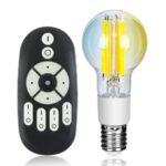 E17調光・調色LED電球、フィラメントデザインのアンティーク風。40W相当、440LMで広配光。リモコン操作可能で、店舗やインテリアの雰囲気を演出。長寿命でおしゃれな照明に最適。