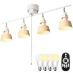 共同照明のシーリングライトは、4灯の調光・調色機能付き。LED電球60W形を含み、リモコン操作が可能。角度調節可能なスポットライトで、ナチュラルな木目調デザインは北欧スタイル。リビングやダイニングにおすすめのおしゃれな天井照明です。
