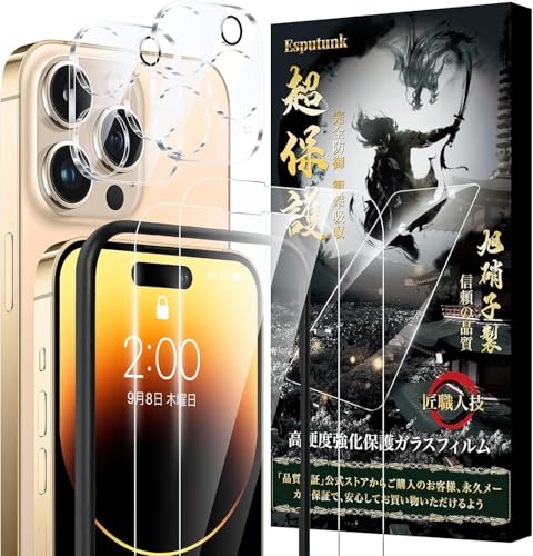 Esputunk 14 Pro ガラスフィルム2枚とカメラフィルム2枚のセット。日本旭硝子製、硬度9Hで耐衝撃、0.28mmの極薄で高透過率。気泡、指紋防止で撥水撥油効果あり。6.1インチ対応。