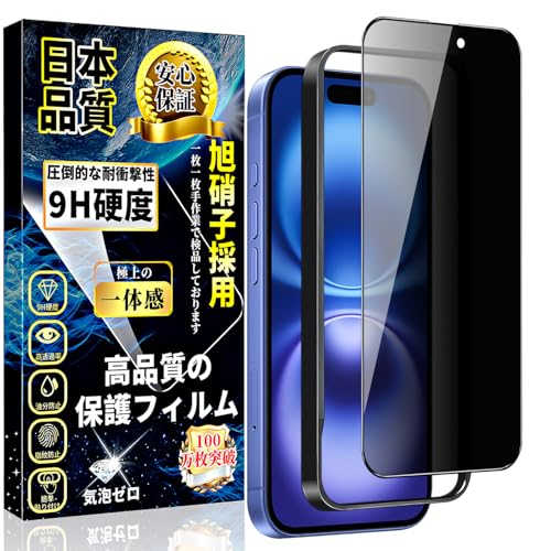 iPhone 16用のガラスフィルムは、覗き見防止機能付きの全面保護タイプ。旭硝子素材で硬度9H、気泡防止や指紋防止機能も完備。自動吸着で簡単装着、ガイド枠付きで、6.1インチ対応。