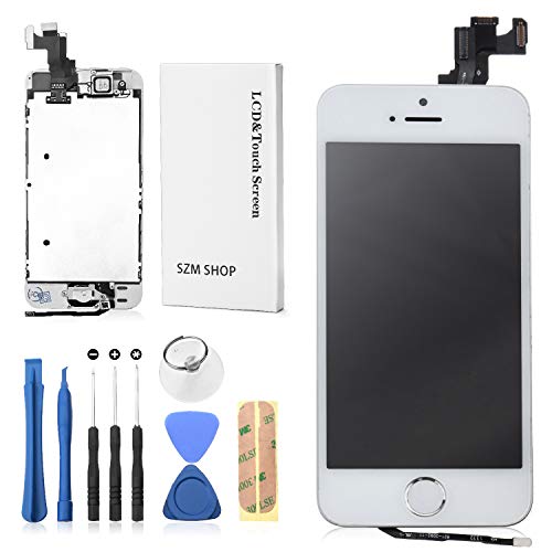 SZM iPhone5S修理用フロントパネルセット。タッチパネル、フロントガラスデジタイザ、LCD液晶パネルを含む。スピーカー、フロントカメラ、ホームボタンも付属。白色モデル。
