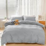 AYOの布団カバー3点セットは、フリル付きのシアサッカー生地で、掛け布団カバー、ベッドカバー、枕カバー、ボックスシーツが含まれます。アイボリー色で洋式・和式兼用、四季通用の洗い替え速乾仕様です。ダークグレーとライトグレーの組み合わせが魅力的です。