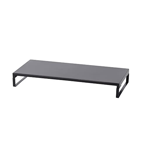 ブラックのスチール製モニタースタンド。幅590mm、高さ105mm。液晶モニターやプリンターに最適な机上台。収納力もあり、オフィスや自宅、テレワークにピッタリの机上ラックです。