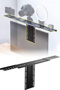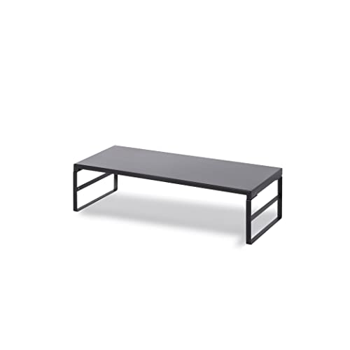 ブラックのスチール製モニタースタンド、ハイタイプで幅590mm・高さ185mm。液晶モニターやプリンターの台として使用可能。収納スペースもあり、オフィスや自宅のテレワークに最適。