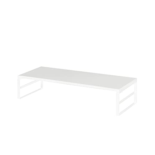 サインキングダムのモニター台は、ホワイトのスチール製で、サイズはW79xD25xH18.5cm。日本製でハイタイプ、液晶モニターやプリンターの設置に最適。収納も可能で、テレワークや在宅勤務にもおすすめの便利な机上ラックです。