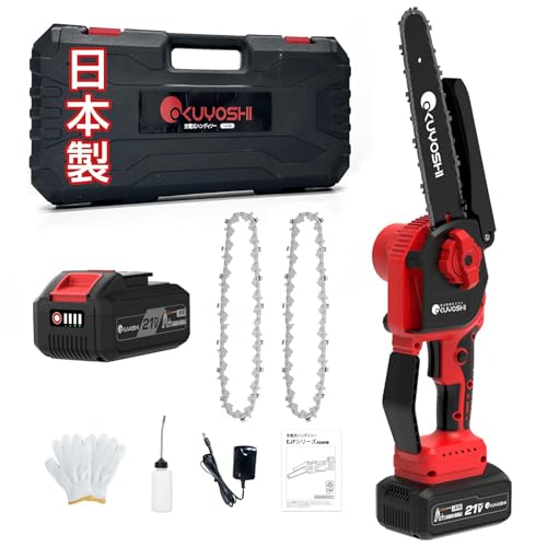 日本製の8インチ充電式チェーンソー。4000mAhバッテリー、ブラシレスモーター800Wで高出力。安全ロック、自動給油、過熱保護機能付き。軽量で片手操作可能、庭木や農業に最適。収納箱付き。