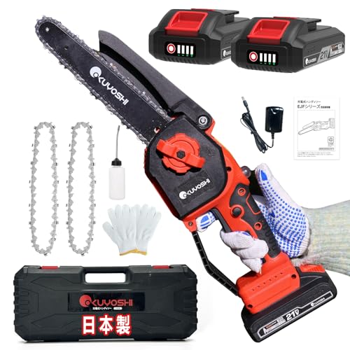 OKUYOSHIの日本製充電式電動チェーンソーは、小型8インチで2000mAhバッテリー2個付き。ブラシレスモーター採用の800W高出力、安全ロック、過熱保護、自動給油機能付き。軽量で片手操作が簡単、枝切りや伐採、園芸に最適。