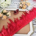 羽根フェザーブレード、レッド色の装飾衣装用リボン。幅8cmから12cmで、長さは約90cm(1ヤード)。刺繍や飾りに最適なアイテムです。