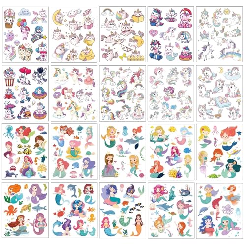 ユニコーン&マーメイドプリンセスのタトゥーシール。女の子向けで防水・安全なカートゥーン顔ステッカー。パーティーグッズに最適で、楽しいイベントを演出します。