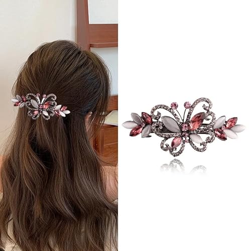 フローラルデザインのバタフライヘアバレッタ。ラグジュアリーなクリスタルラインストーンを使用したレッドカラーのクリップは、女性へのギフトに最適です。