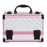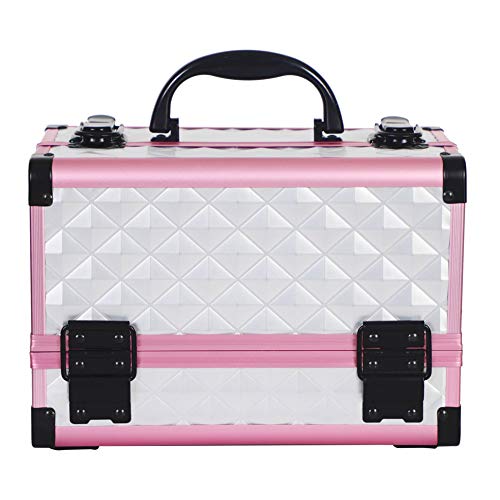 プロの化粧品ケースで、2層のアルミスーツケースデザイン。ハンドヘルドミラー付きで、ネイルやタトゥー用の収納にも最適。おしゃれなピンク色。