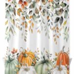 秋の感謝祭デザインのシャワーカーテン。オレンジ、ホワイト、グリーンのパンプキン柄で、長さ72 x 72インチ。防水・洗える素材で、素朴な葉の装飾がバスルームを彩ります。