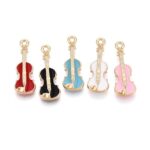 合金バイオリンチャームのセット。10個入りで、本物の18Kゴールドメッキとエナメル仕上げ。サイズは23x8x3mm。ミックスカラー(S)のデザインで、ネックレス、ブレスレット、イヤリング、キーチェーンなどに最適。