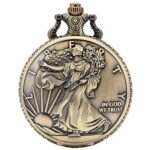 ヴィンテージ男女兼用のネックレス、懐中時計、自由の女神記念コイン。1オンス純銀1ドルコインはコレクター必見のユニセックスノベルティです。