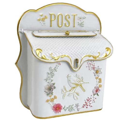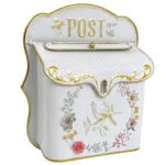 ヴィンテージ風の壁掛け郵便ポスト。金属製でアンティーク調、シックなデザインが特徴。屋外用で、レトロなフラワー柄が魅力。郵便受けとして便利です。