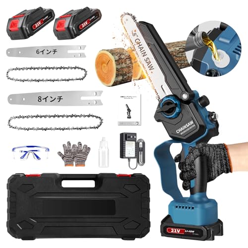 充電式チェーンソー(2025年モデル)。9m/sブラシレスモーター搭載、切断径15-20cm、2.0Ahバッテリー2個付属。軽量・強力で自動給油機能あり。安全ロック、工具不要、竹や枝切り、庭木剪定に最適。ケース・替え刃・日本語説明書付き。