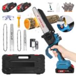充電式高枝チェンソー1本2役、8インチ&6インチハンディ仕様。自動給油、ブラシレスモーターで切断径15-20cm。2.0Ahバッテリー2個付属。軽量・強力、工具不要、安全ロック付き。庭木剪定に最適。