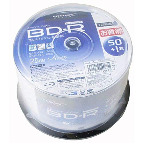 HIDISC BD-R 1回録画、4倍速、25GB容量のディスク51枚入りスピンドルケース。高品質な映像保存に最適で、長期間保存が可能です。