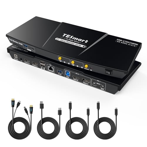 TESmart KVMスイッチは、USB-C、HDMI、DisplayPort対応の2入力2出力で、MST、デュアルモニター、4K@60Hzに対応。USB3.0、ギガビットLANポート、ホットキー、EDID機能あり。リモコン、入力ケーブル付属。
