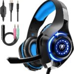 ブルーのゲーミングヘッドセット。PS4/PS5/Xbox One/PC対応。50mmドライバーで重低音強化。3.5mm接続、有線、マイク付き。騒音抑制、軽量設計で快適な使用感。