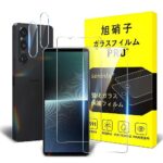Xperia 1 V用の強化ガラスフィルム2枚とカメラフィルム2枚のセット。硬度9H、厚さ0.26mm、2.5Dラウンドエッジ加工で高透過率。気泡ゼロ、スクラッチ/衝撃吸収、撥油性、指紋防止。