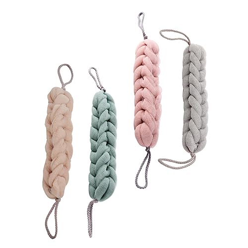 FOYTOKI 背中洗いスクラブタオルは、肌に優しい泡立ちで、ロングストリップデザインが特徴。家庭用やホテル、キャンプに最適な収納バッグ付き。4個セットで色指定不可、ランダムカラーでお届けします。