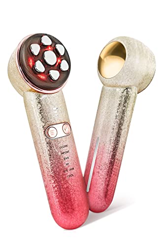 EMS美顔器は多機能で、RFラジオ波とイオン導入・導出、LED光エステ、超音波振動を搭載。3段階のレベル調整が可能で、毛穴ケアや引き締めにも効果的。目元・顎専用モード付き、家庭用の美容機器として最適。2年保証付き。