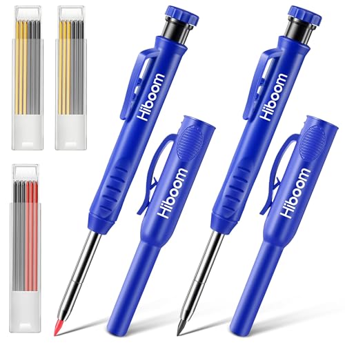 Hiboomソリッドカーペンター鉛筆は、替芯18本と鉛筆キャップ付き。ロングノーズ設計で深穴マーキングが可能。内蔵シャープナーで、建設・木工・建築家向けに最適なツール。色はブルー。