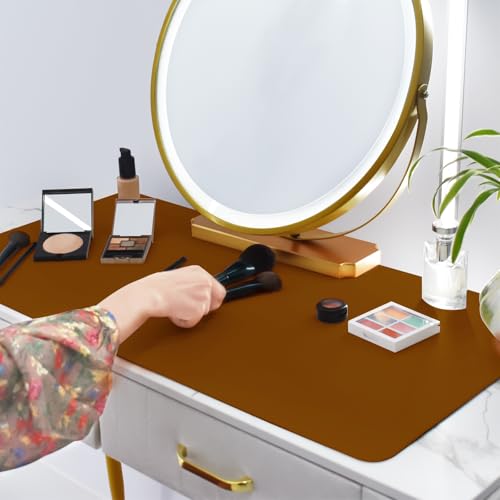化粧台トッププロテクター用メイクアップマット。ブラウン&グレーのデザイン。サイズは23.6×11.8インチ、耐久性あり、テーブルを保護しつつ、おしゃれな雰囲気を演出します。