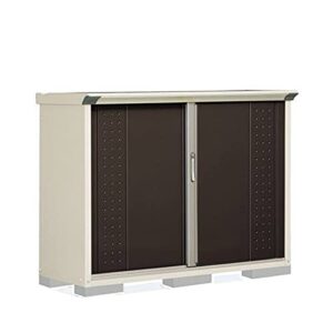 鍵付きの屋外用物置です。サイズは幅90cm、奥行45cm、高さ84cm。サビに強く、吊り戸式で棚板は1枚、調整可能。転倒防止設計により安心して使用できます。ベランダ収納にも最適な小型倉庫です。