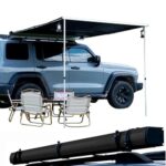 Vrapnudcカーサイドタープは、2x3Mのサイズで、UV50+の耐候性を備えた自家用車用のサンシェードです。軽量でロールアップ収納が可能、アルミニウム製で高さ調節ができます。