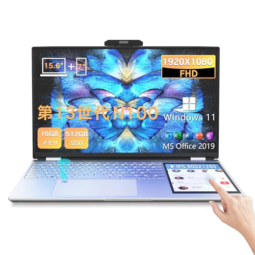 ノートパソコン第13世代、15.6インチFHD液晶+7インチタッチパネル。200万画素WEBカメラ、指紋認証、バックライトキーボード搭載。性能はDDR4 16GB、SSD 512GB。Windows11、Office付属。