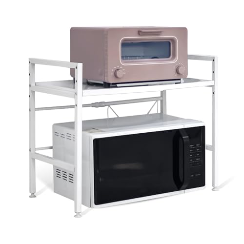 HomeDemeur拡張可能電子レンジラックは、耐久性のあるカーボンスチール製。カウンタートップ収納に最適で、食器や電子レンジを整理できます。6個のフック付き。ホワイトカラー。