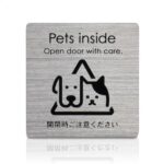 表札AKIグラスショップの開閉時ご注意ステッカー。犬や猫の脱走防止に有効。両面テープと強力マグネット付きで設置簡単。ステンレス製で耐水・耐候性あり。おしゃれなデザインで置き配にも最適。