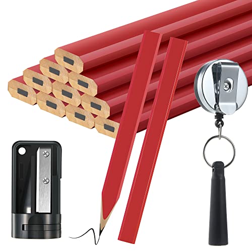大工用鉛筆14本セット。7インチのフラット八角形デザインで、ハードブラックの芯を使用。高耐久で、鉛筆削りと格納式鉛筆ホルダー付き。業務用に最適なレッドカラー。