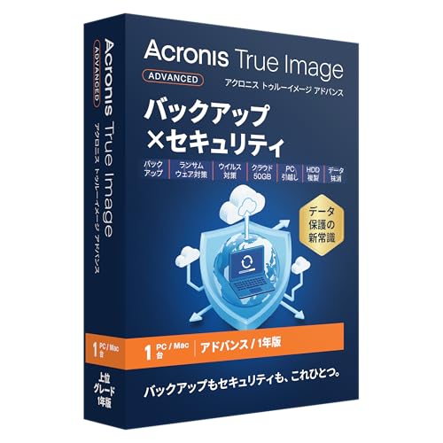 Acronis True Image Advancedは、1台のPC用のバックアップソフトウェアです。50GBのクラウドストレージが含まれており、2026年までの1年間のライセンスが提供されます。日本市場向けの製品です。