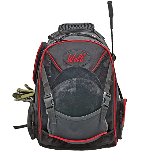 WOLTの乗馬用バックパックはヘルメットホルダー付きで、複数のコンパートメントを備えています。すべてのアクセサリーを収納可能。サイズはMで、ブラックとレッドの組み合わせ。