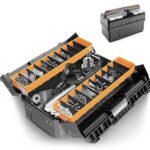 大容量の2段折りたたみ式工具箱。両開きデザインで、取っ手付き。金具で頑丈に作られ、収納ボックスとして最適。システム収納BOXやタックルボックスとしても使え、電動工具や小物入れにも便利。積み重ね収納が可能で、スッキリ整理できます。
