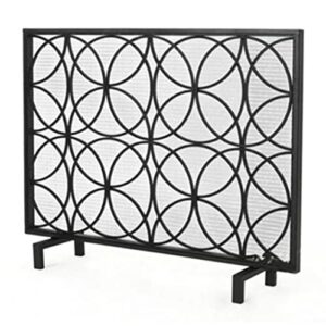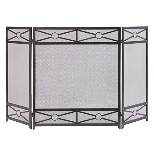 暖炉用の3パネルスクリーン。ブラックアイアンメッシュで装飾模様付き。サイズは31.5インチ×50インチ。スパークガードカバー付きで安全性もバッチリ。