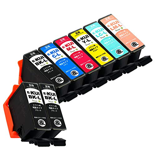 エプソン用互換インクカートリッジ KUI-6CL-L 8本セットです。増量タイプでBK×3、C、M、Y、LC、LMが含まれ、残量表示機能及びICチップに対応。安心の一年保証付きで、Green Shower製です。
