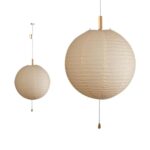 E26ソケットのペンダントライト。生成のペーパーシェードが特徴的な和風デザイン。2灯式、幅50cm。間接照明としても最適で、LED対応。手作りの温かみがあり、ダイニングや和室にぴったり。