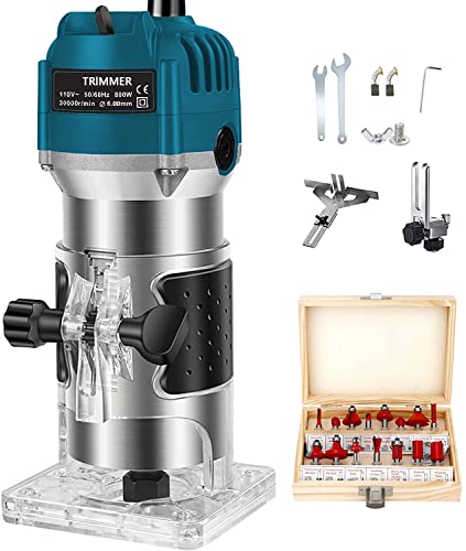 KKnoon 電動トリマーは6.35mmのコンパクトで軽量な彫刻刀。30000rpmの高速回転、800Wのアルミシェルで電動/穴あけ/切断/彫刻/研磨に最適。15個のフライスカッター付属。