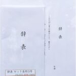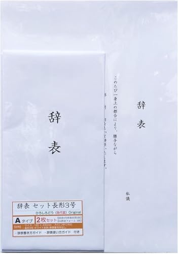 辞表セットAには、A4サイズの辞表フォーム(2枚)、長形3号の辞表封筒(2枚)、利用ガイド(2枚)が含まれています。全て日本製で、字体タイプAのデザインです。浩代堂のオリジナル商品です。