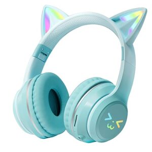 子供用ヘッドホン Megadream マイク付き 無線/有線聴覚保護 子供 成人 兼用 折りたたみ式 ネコ耳ヘッドフォン 猫耳LEDライト/両側RGBライトデザイン サイズ調節可能 学校/タブレット/旅行/MP3 (緑色)