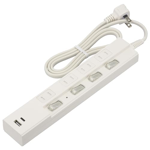 オーム電機の電源タップHS-TPKU41PD23-Wは、4個口の雷ガード付きで、急速充電対応のType-C/Type-Aポートを備えています。長さは1mで、使い勝手の良いホワイトカラーです。