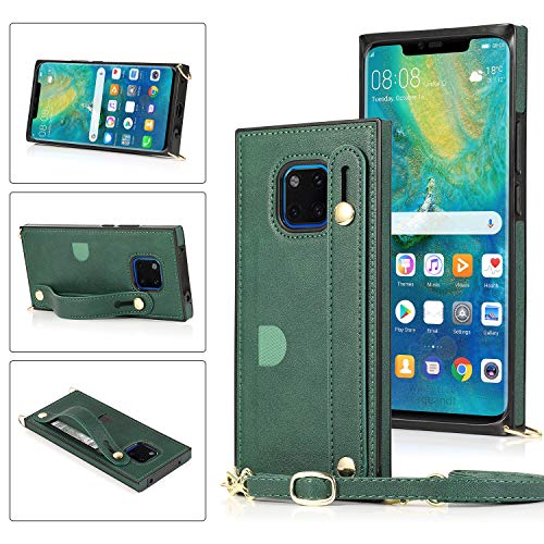 Huawei Mate20 Pro対応のショルダーケース。PU皮革製でスタンド機能や定期入れ付き。薄型軽量で指紋防止、落下保護、Qiワイヤレス充電対応。ダークグリーン。