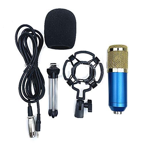 USB接続のコンデンサーマイクで、PCやカラオケに最適。卓上設置可能で、三脚、スポンジ、ポップガードが付属。生放送にも対応。デザインはブルーとゴールドが特徴。