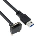 CYケーブル Micro USB3.0デュアルネジタイプ。USB3.0データ転送速度5Gbps、電源供給に対応。90度下向きデザインで、VR産業用カメラやコンピューターに最適。長さは3.0mです。