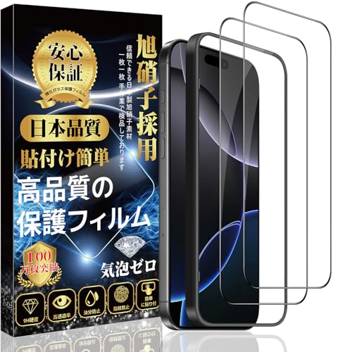 iPhone 16 Pro対応の旭硝子製ガラスフィルム。硬度9Hの耐衝撃性、撥水・撥油加工で指紋防止。高透過率で気泡ゼロ、貼り付け簡単。2枚セット。
